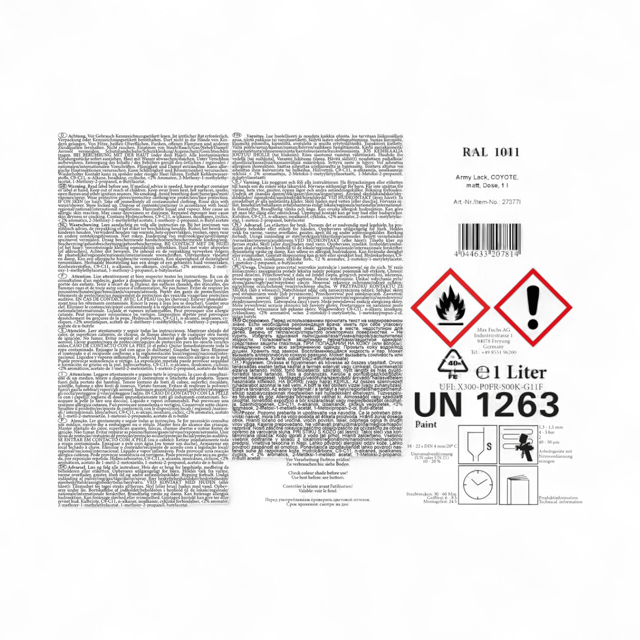 Professional synthetic resin-based finishing paint, quick-drying and with excellent adhesion to various types of surfaces. Ideal for military or utility camouflage applications, both indoors and outdoors.