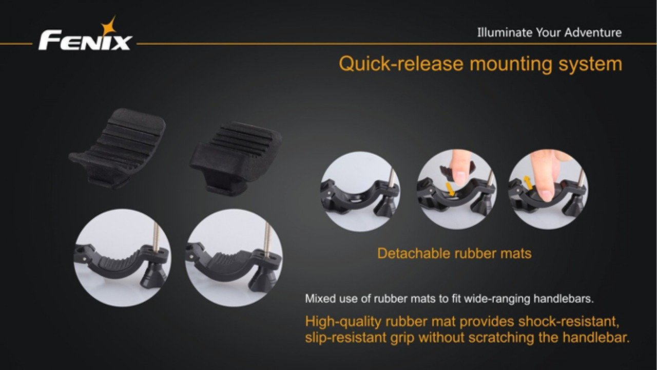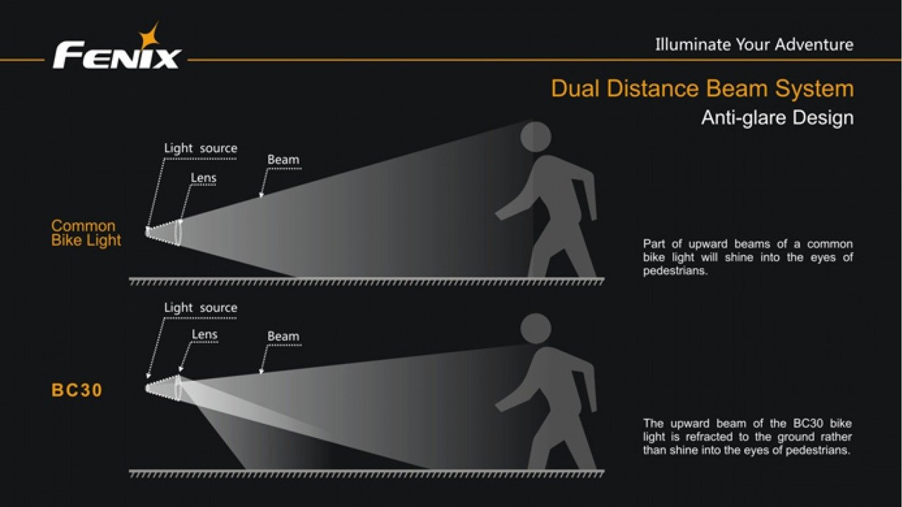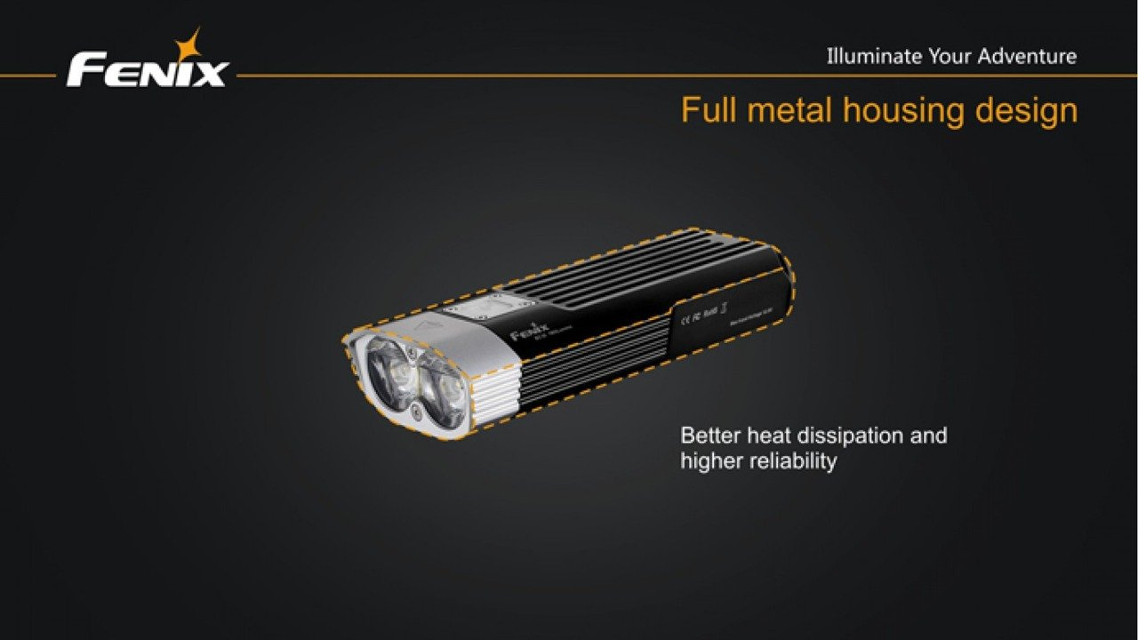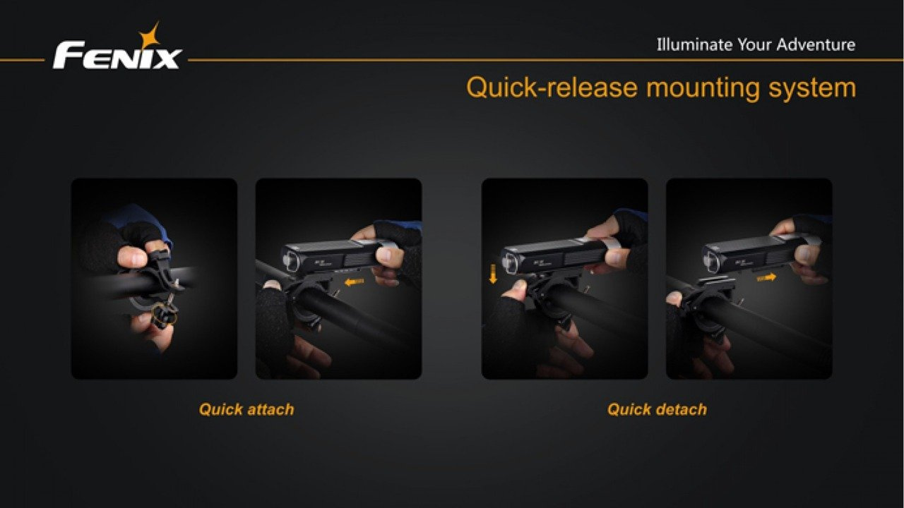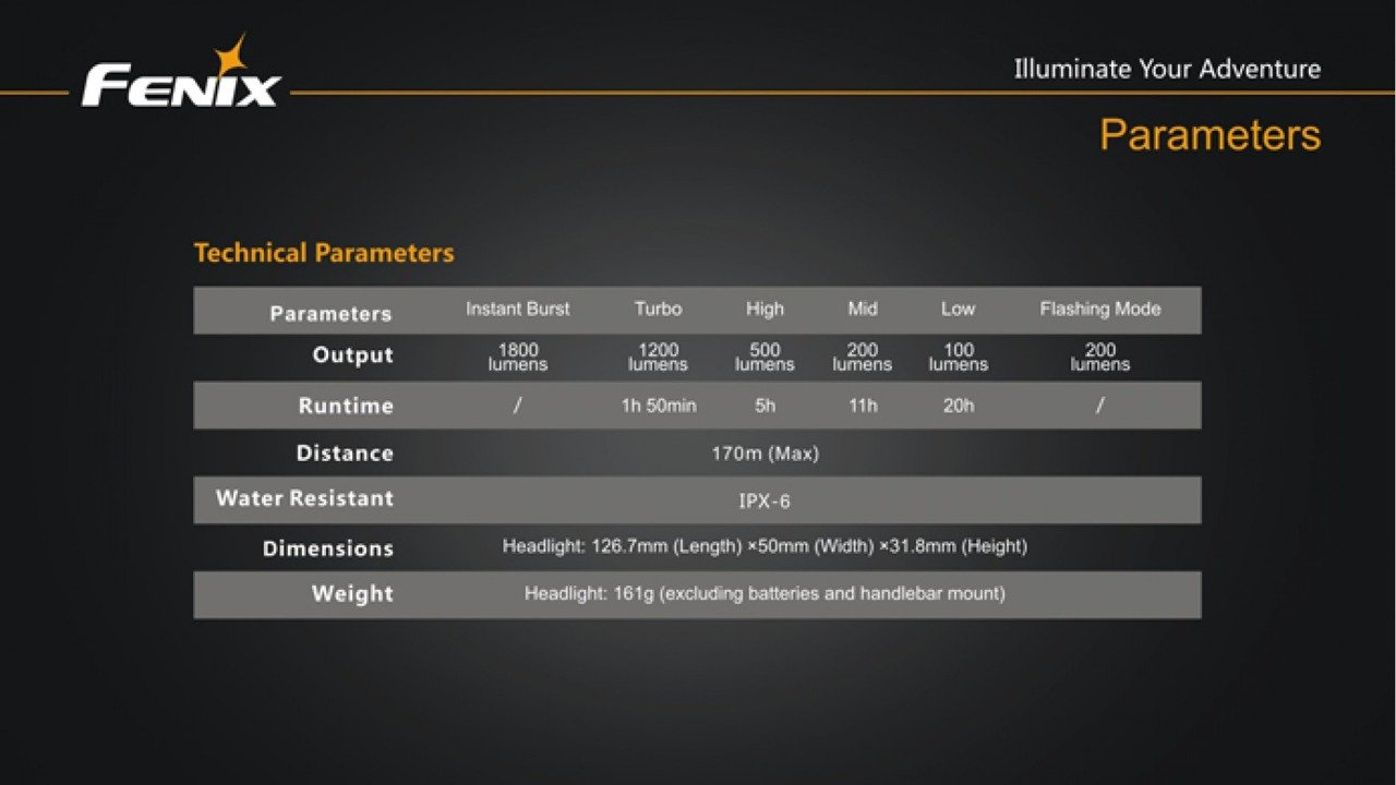The Fenix BC30 Bike Light puts self-contained 1800-lumen max output at the ready. Remote burst activation and the exclusive Dual Distance Beam System make the BC30 effective on road or trail up to 170m. Choose 18650 rechargeables or CR123A batteries to power four brightness levels and a warning mode, all guarded by a rugged bar-mounted housing.