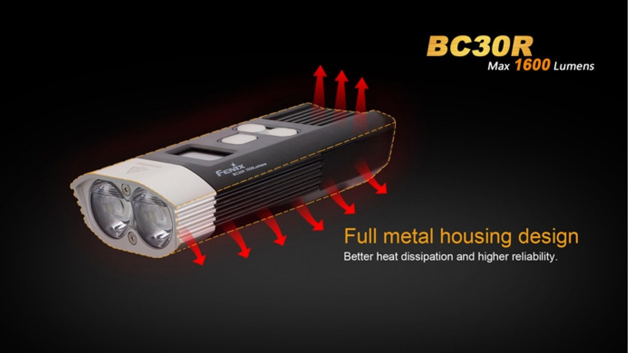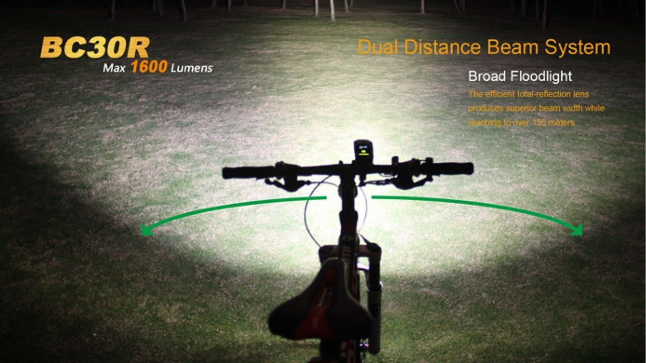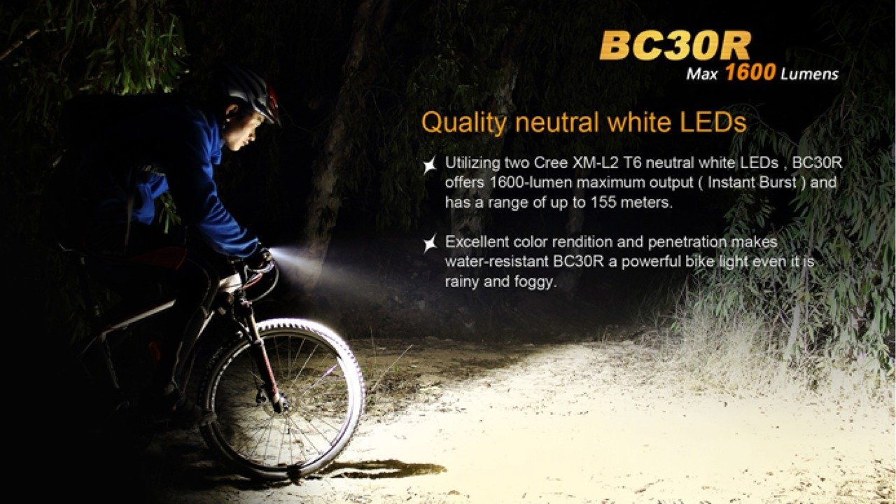 The Fenix BC30R USB rechargeable bike light features the industries first digital display screen for confidence in your runtime readings. Compact body with built-in rechargeable batteries and a quick on/off release allows this versatile light to light your trails and streets with outputs reaching as high as 1600 lumens and runtimes reaching over 20 hrs.