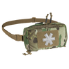 The pouch is accessed via a two-way zipper. Inside there is a velcro panel for mounting the Med Insert, two elastic ribbon loops, two Paracord loops, and a mesh pocket with an elastic drawstring. The pouch is available in several colors, has a velcro panel with a reflective paramedic cross embroidered, a detachable hip belt, and in the bottom part, three ribbons and an elastic drawstring. It is MOLLE/PALS-compatible.