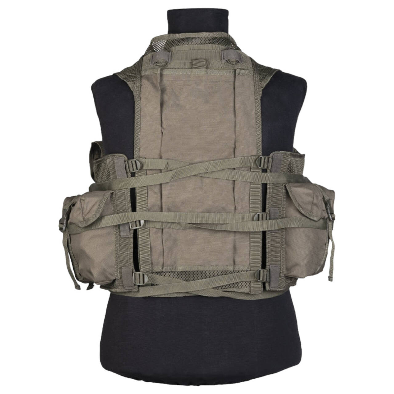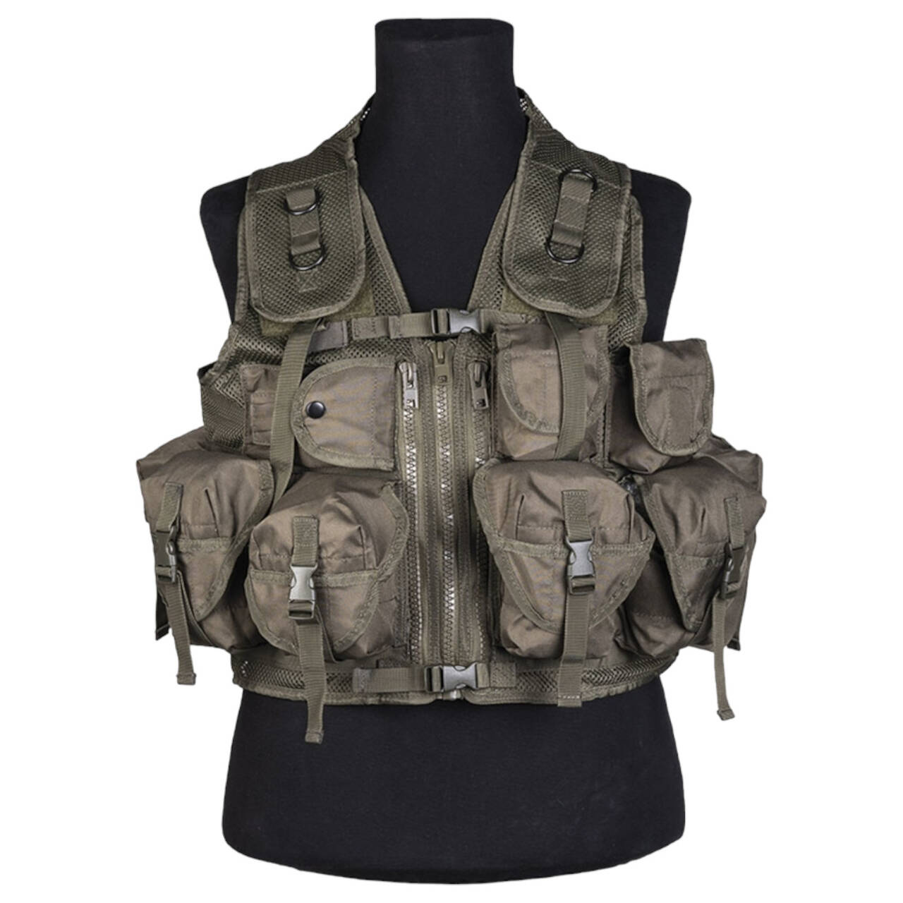 - tactical vest made of netting with 9 pockets and a big back pocket with hook and loop closure