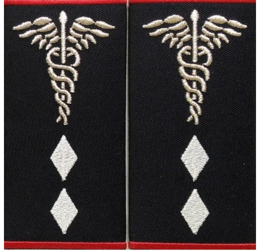 Grade Paramedic Debutant ambulanță tip manșon, tubulare, brodate cu fir Madeira Polyneon, 100% poliester, de culoare roșie și metalică argintie. Conturul exterior este roșu. Întreaga broderie este aplicată pe un material de suport cu întăritură termocolantă din țesătură 65/35% bumbac/poliester. Culoarea suportului este navy și realizează un contrast perfect cu firele folosite la broderie. Datorită utilizării materialelor de cea mai înaltă calitate, gradele pot fi utilizate în exterior, fiind extrem de rezistente la vânt, ploaie, raze solare, precum și la spălări multiple.
