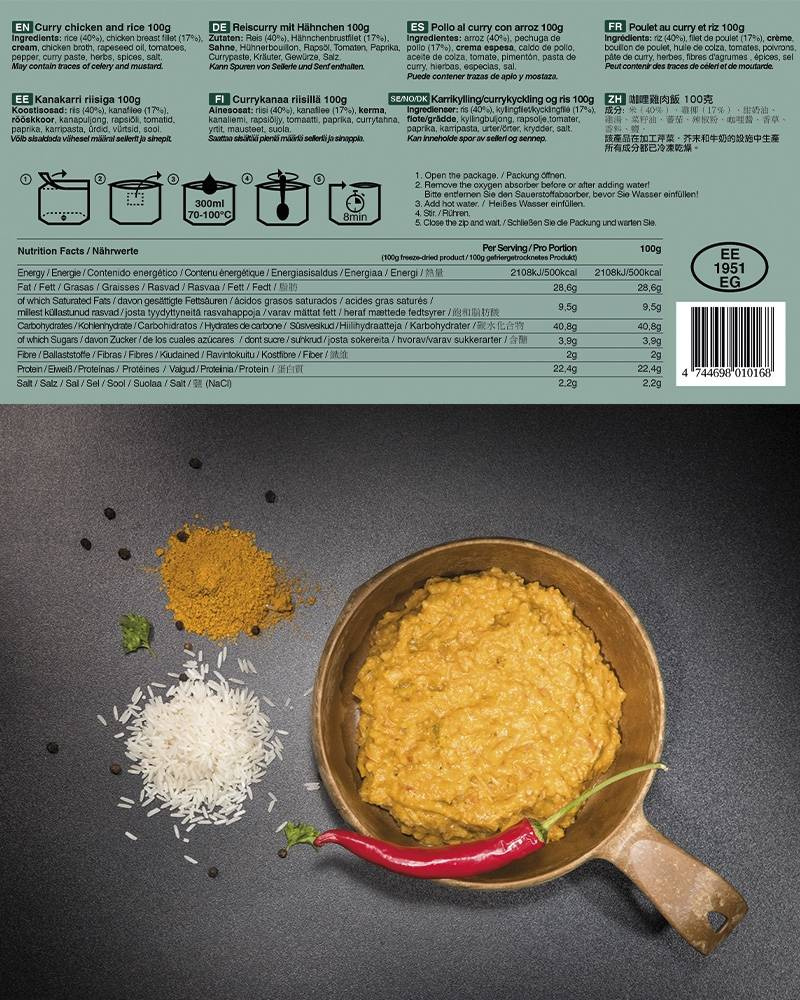 rice (40%), chicken breast fillet (17%), cream, chicken consommé, rapeseed oil, tomatoes, pepper, curry paste, herbs, spices, salt