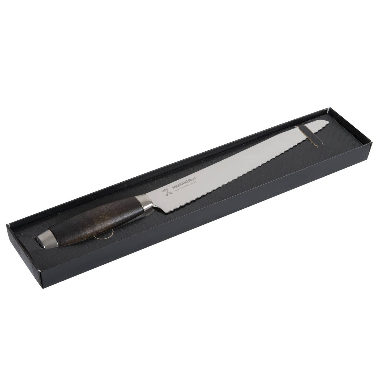 The bread knife is made of Swedish stainless steel of the highest quality, hardened according to our secret recipe in Mora. The integrated finger guard makes for safer handling and the handle has been ergonomically shaped to prevent your knuckles from hitting the chopping board. This hand-made knife with its real wooden handle and beautiful details, such as the Dala coat of arms on the metal ring, enhances your kitchen experience even further.