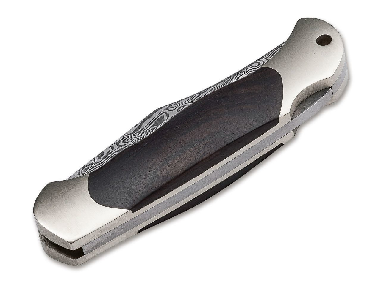For the 2019 Annual Damascus Collector's Knife, we chose the Scout Junior as the base model, which is one of our favorites, with its medium size between the full size Scout and the small Boy Scout, suitable for comfortable pocket carry as well as effective use. The CNC milled nickel silver handle features an inlay crafted of Grenadill wood, which creates an attractive contrast to the handle and the blade. The blade is made of powder metallurgical Damascus steel from Sweden, which not only boasts excellent corrosion resistance, but also a high hardness and edge retention, which makes it a great knife for everyday use. The blade is secured with a sturdy backlock. All in all, this Annual Damascus Collector's Edition is not only a precious collector's piece, but also an exquisite accessory. Production is limited to just 999 pieces, each handmade at the Boker Manufactory in Solingen. Comes in a frame case for attractive presentation.