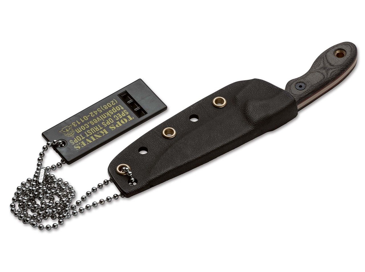 The Mini Scandi Neck Knife is one of the most popular models from TOPS. Designed right on the transition from neck knife to belt knife, the Mini Scandi stands out with both carrying options! As a derivative of the successful "Brothers of Bushcraft? knife, the Mini Scandi takes its cues from Scandinavian blade shapes, specifically from Sami knives. In its diminutive shape, the Mini Scandi offers versatility and utility in spite of its compact size and high carrying comfort. The MSK Survival features black canvas mircata scales with red fiber spacers for a secure grip even in wet and cold conditions. Powder-coating in coyote tan. Modified scandi grind. 1095 carbon steel. Shipped with kydex sheath and ball chain.