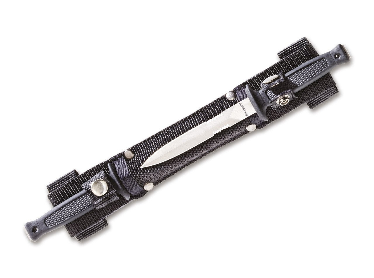 The Magnum Doublette knife set can easily be worn horizontally on the belt. The 10-centimeter-long 420 dagger blades are partially serrated on both sides and are securely inserted in the nylon sheath. The handles made of plastic elastomer guarantee the best handling even in bad weather conditions.
