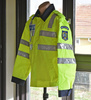 The jacket is made of waterproof, two-layer laminated polyester fabric in fluorescent yellow-green colour to ensure a high degree of visibility during day, night or adverse weather conditions.