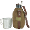 Campaign Canteen with cup with foldable hadle attached to it. Made out of aluminum, has a canvas cover and leather straps with metal carabiner to attach to belt or haversack. Romanian Military Surplus.