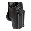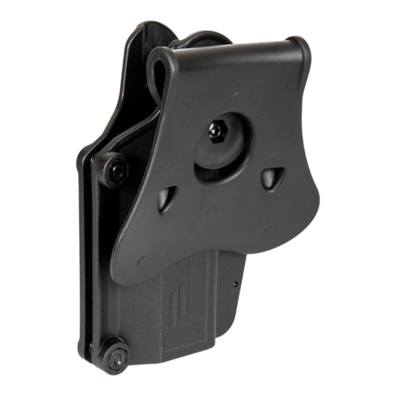 Pistol holster made of durable and lightweight polymer, weighing only 170 g, ideal for use in airsoft or tactical training. Its modern design allows for full 360° rotation, adjustable with an Allen key, for quick access and customised positioning.