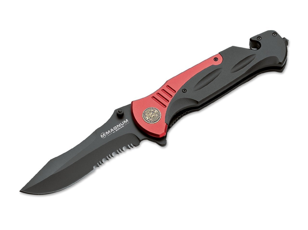 The Magnum Fire Chief is an impressive rescue knife specifically designed for emergency situations. With a partially serrated blade, safety hammer and belt cutter, this knife is equipped to handle emergency situations. A stable linerlock ensures user safety, and the red and black design makes it easy to identify as a rescue tool. The gold emblem embedded in the handle dedicates the knife to the men and women of fire brigades. With clip. However, it is important to note that this knife is not recommended for everyday use or heavy professional use. For these purposes, specially designed models such as the Boker Plus Savior or the FKMD A.L.S.R. 2 are recommended.