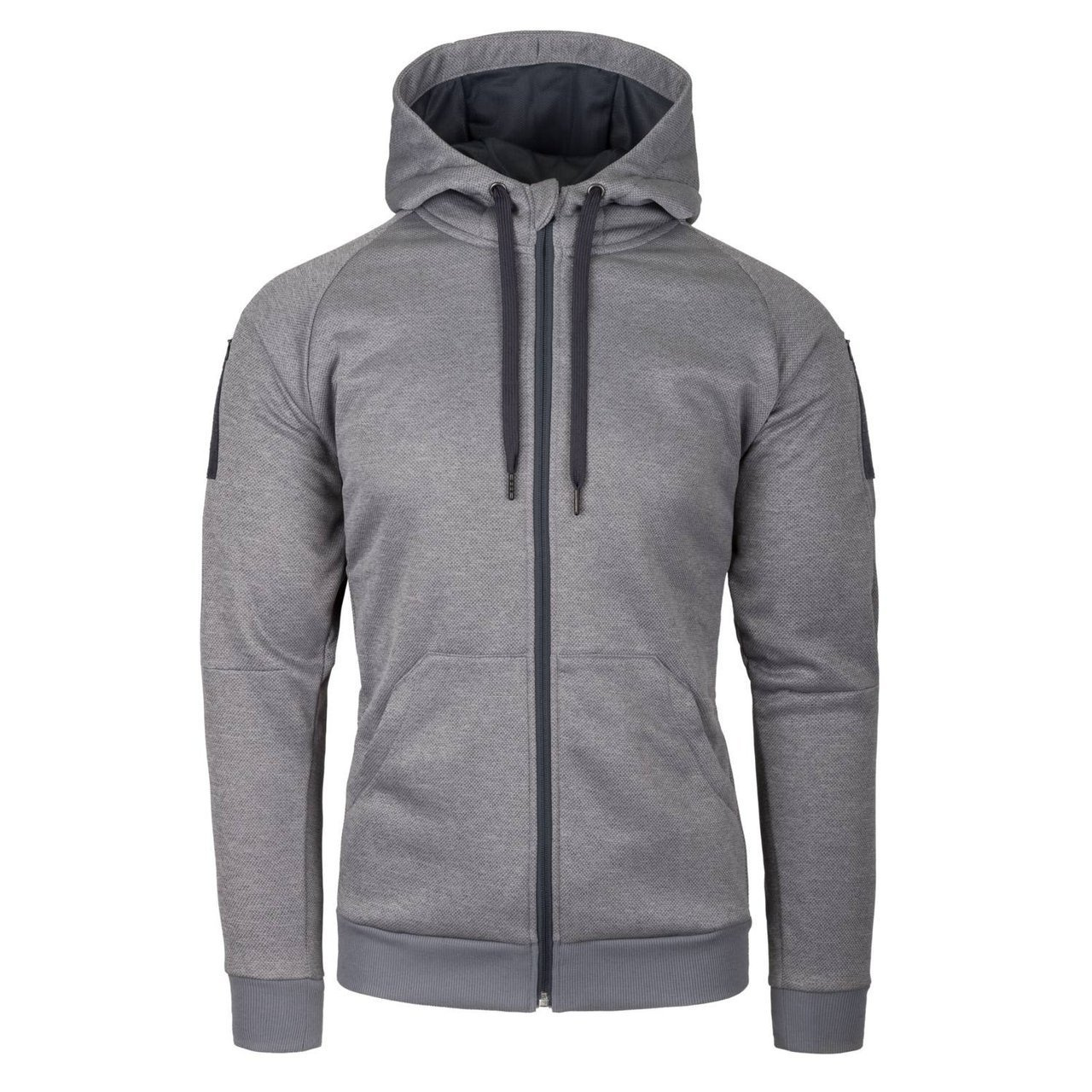 URBAN TACTICAL HOODIE® is a lightweight, full zip hoodie jacket. Simple, low profile cut and elastic fabric make this jacket perfect for any urban operations. Two classic front pockets will accommodate all your essentials to which you need quick and easy access, but can also work as a hand warmer pockets in cold days. Additionally inside those pockets there are smaller, hidden pockets closed with a zipper. Two inner mesh pockets will fit your wallet or documents, preventing them from being stolen or lost. Zippered pockets on shoulders are closed with concealed zippers, almost invisible from a distance. On biceps there are large loop panels for personalization. Additional loop panel is on the back of adjustable hood.