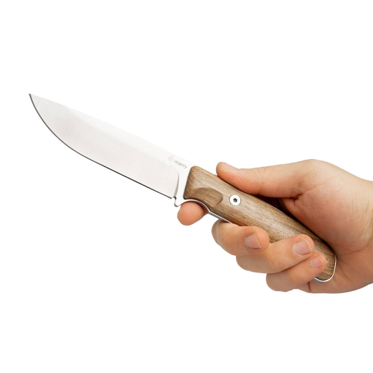 The Manly Blaze Walnut is a sturdy hunting and outdoor knife with its elegant lines and high versatility. The full-tang construction made of D2 has contoured handle scales made of high-quality walnut wood, which offers a comfortable grip and gives the knife a classic appearance. The index finger choil and the jimpings by the thumb rest provide even more safety when cutting. Comes with a fitted brown leather sheath.