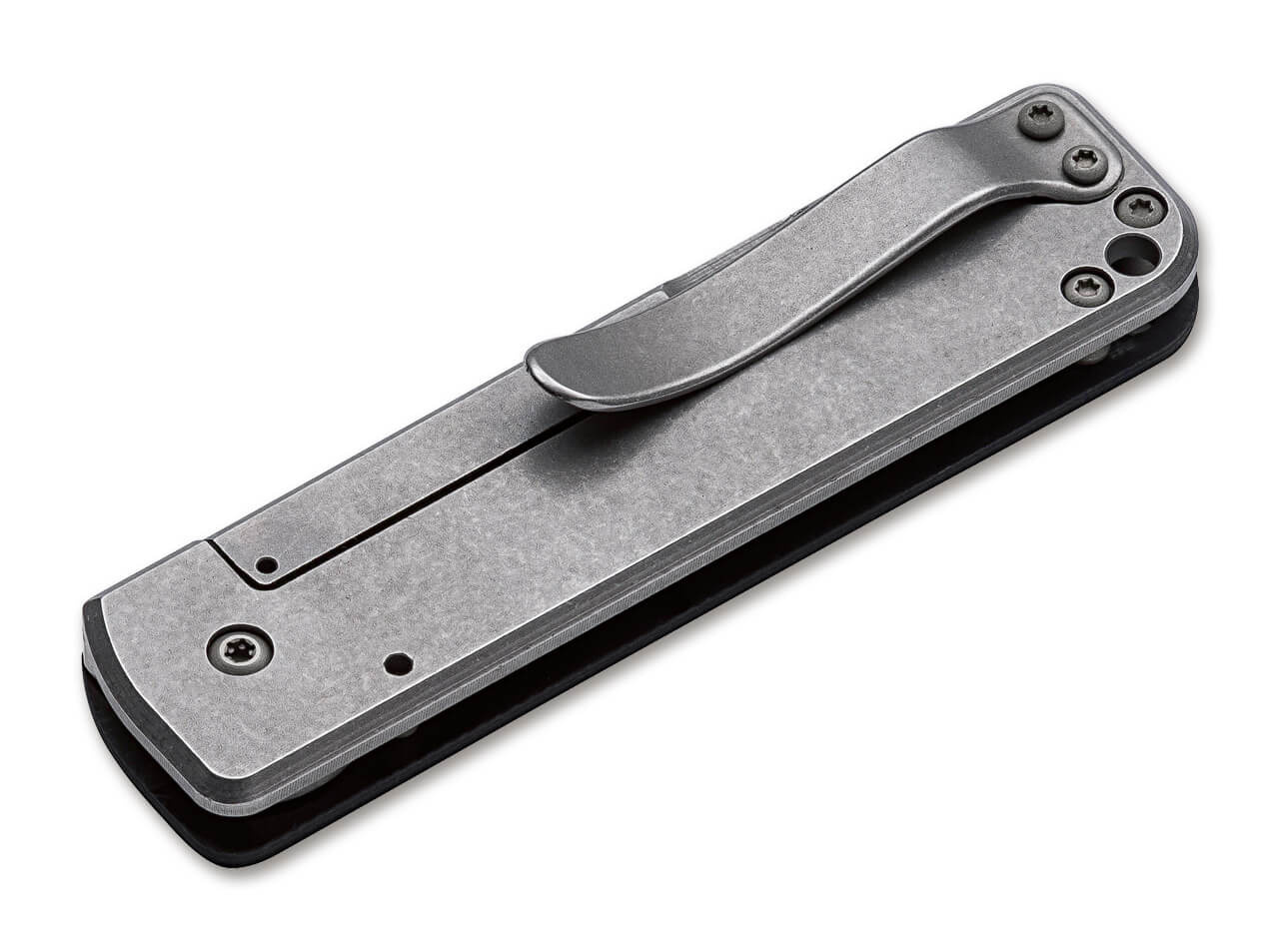 In its two-handed version, the popular Boker Plus Lancer has a stonewash D2 blade that opens with a nail nick and is secured with a sturdy framelock. The design by Ukrainian knifemaker Serge Panchenko is compact and very flat and thus easy to carry. The sturdy build conveys reassuring solidity and ruggedness. The front handle scale is made from textured G10, while the back is made from stainless steel and houses the framelock. With a lanyard hole, a clip (tip-up) and a high-quality nylon case for storage.