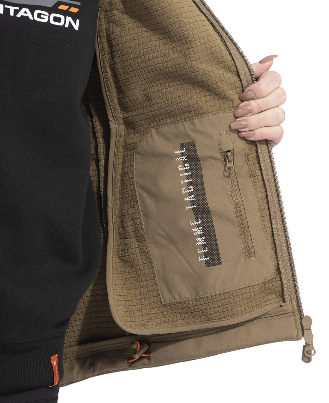 The concealed hood in the collar is easily accessible and 3-point adjustable, the large chest pockets have interior compartments for all necessary accessories, and the headphone cable outlet port is located on the right chest pocket. The sleeve pockets have Velcro straps, so the jacket can be customized with patches.
