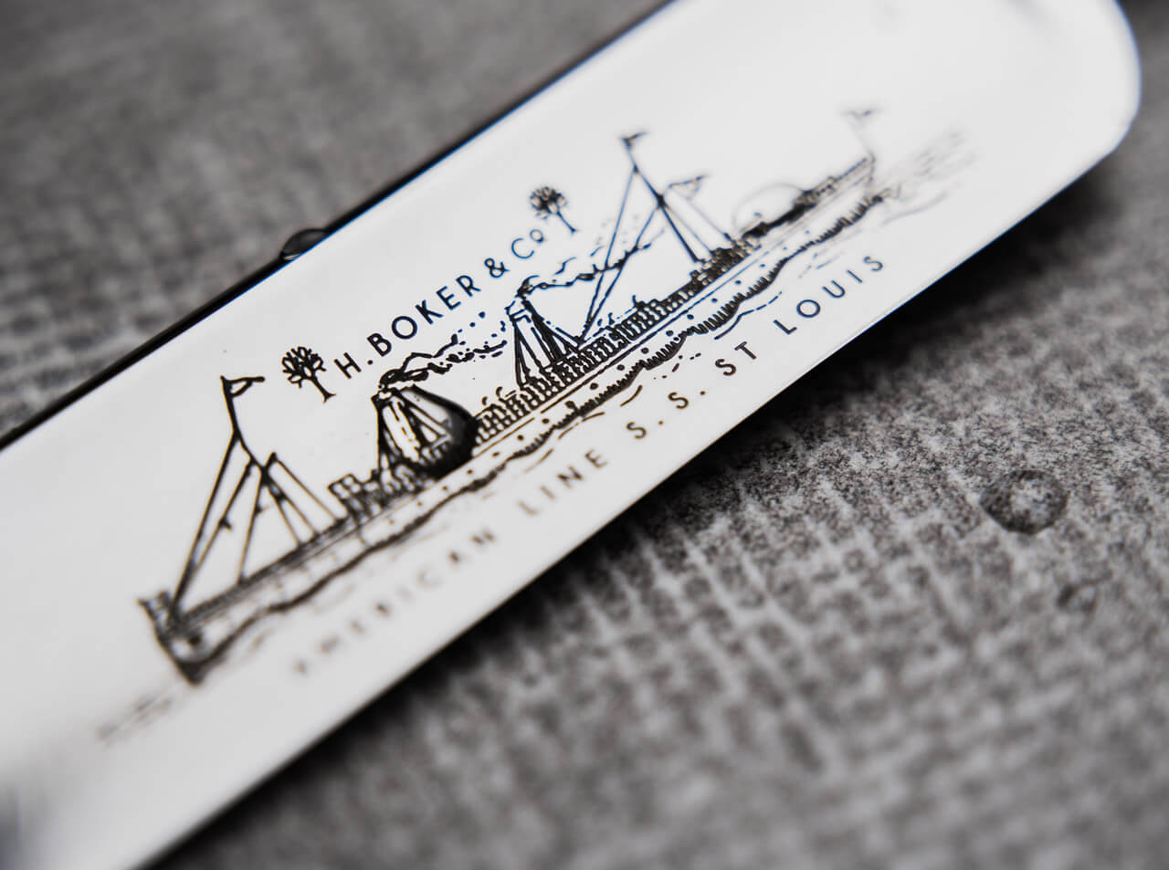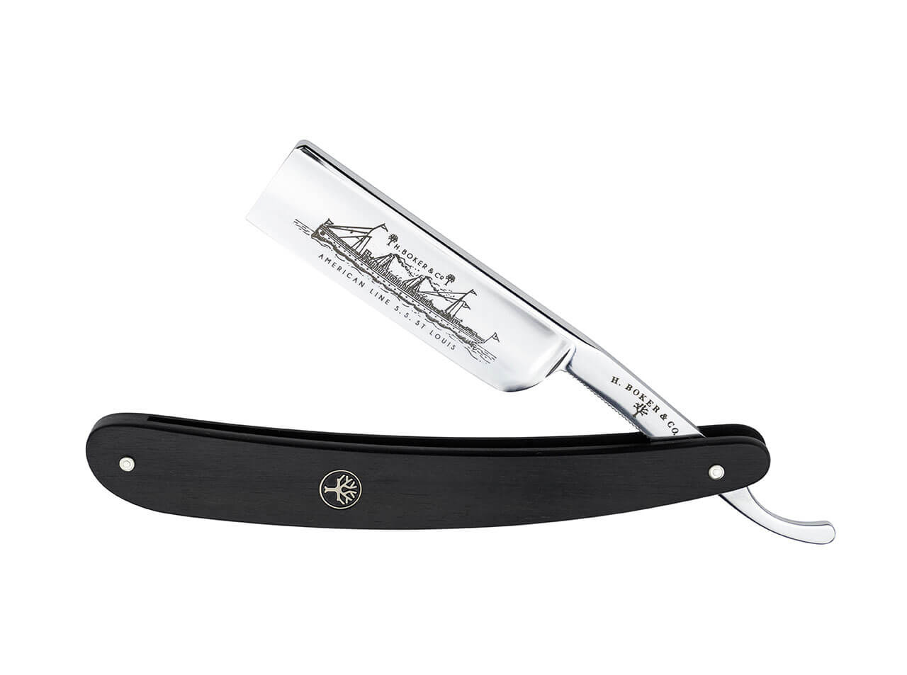 Promising faraway places, the gentle sound of the waves, and the seemingly endless expanse of the ocean: on her maiden voyage from New York to Southampton in June 1895, an exuberant holiday mood prevailed on board the S.S. St. Louis. At that time, the passenger ship was considered one of the prestige objects of the influential American Line and sweetened the departure to distant Europe for up to 1,370 passengers with exclusive luxury spread over a length of 169 m at a pleasant cruising speed of 19 knots (approx. 35 km/h) - fine appetizers and stylish comfort included! With its quadruple-expansion steam engine, the S.S. St. Louis was one of the largest and most powerful ocean liners under the American flag at the turn of the century. Mainly intended for transatlantic liner traffic between America and Europe, the steamship was temporarily used as a troop carrier during the Spanish-American War and the First World War. After this turbulent period, the ship was to be fully reassigned to liner service, but in 1920 a major fire on the ship put an abrupt end to this project. In the spirit of the transatlantic liner launched in 1894, Boker presents the American Line S.S. St. Louis, a new edition of the historic Boker razor, limited to 300 pieces worldwide, which brings back the glamour of bygone days and transforms every shave into a breath of exotic faraway places. The imposing ship adorns almost the entire front of the polished 6/8" blade made of carbon steel. The degree head used is the perfect blade shape among connoisseurs for a precise shave of the contours. The blade is stamped with the historic H. Boker & Co. stamp and serrated on the underside. The material used for the handle scales is exquisite ebony, which thanks to its dark coloring is reminiscent of the hull of the S.S. St. Louis, while two studs as well as the Boker tree emblem harmoniously accentuate the crowned hilt. The motif on the blade as well as the historical stamp have been elaborately restored and lasered onto the razor using the most modern techniques. Supplied in a lovingly recreated historical neck box.