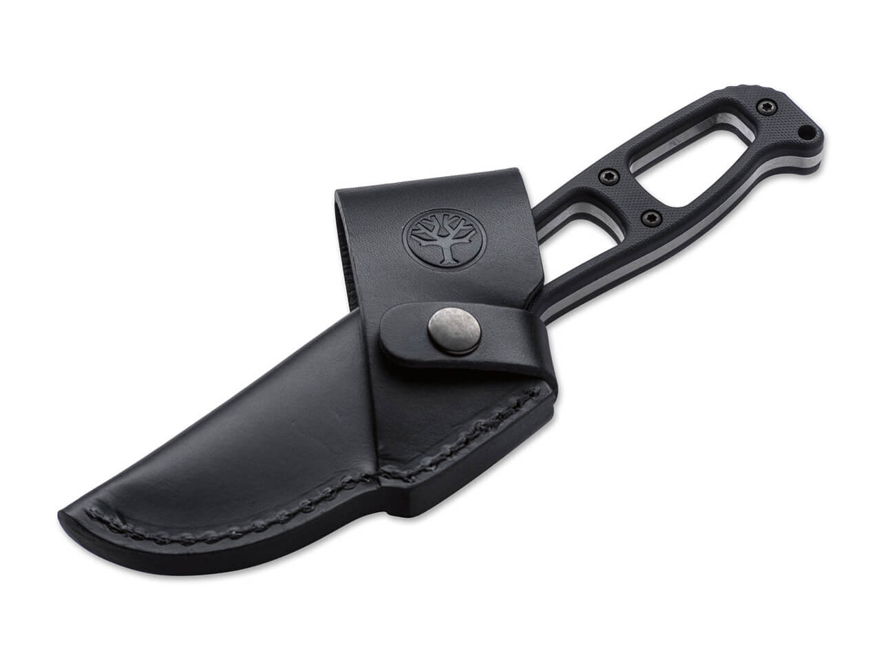 The original sheath for the Böker G.E.K. EDC (120646) is made of high-quality black leather. The symmetrical construction and the push-buttoned bolt on both sides allow unrestricted use for both right- and left-handers. Designed for cross-draw carrying (diagonally on the belt).