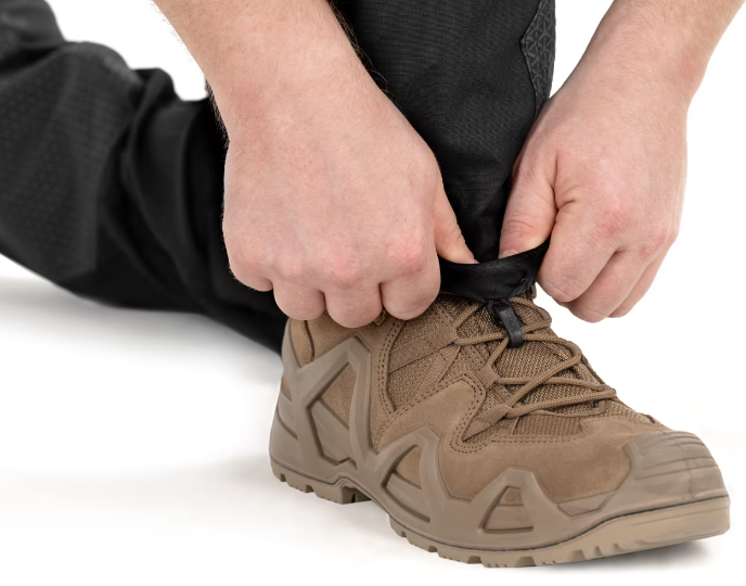 Fine adjustment of fit is achievable via hook-and-loop waist tabs, external leg tabs with hook-and-loop adjustment, and an internal knee lock drawcord.
