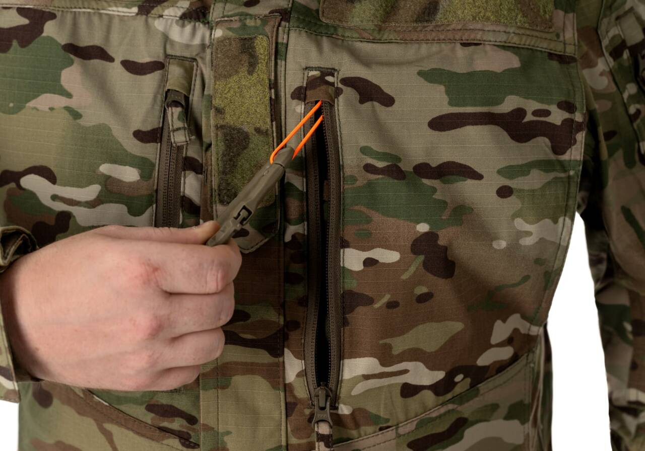 On both upper arms, a bellows-style storage pocket is provided with YKK reverse coil zipper closure. Inside the pocket, beckets are provided for the safe attachment of equipment or the storage of individual first aid items.