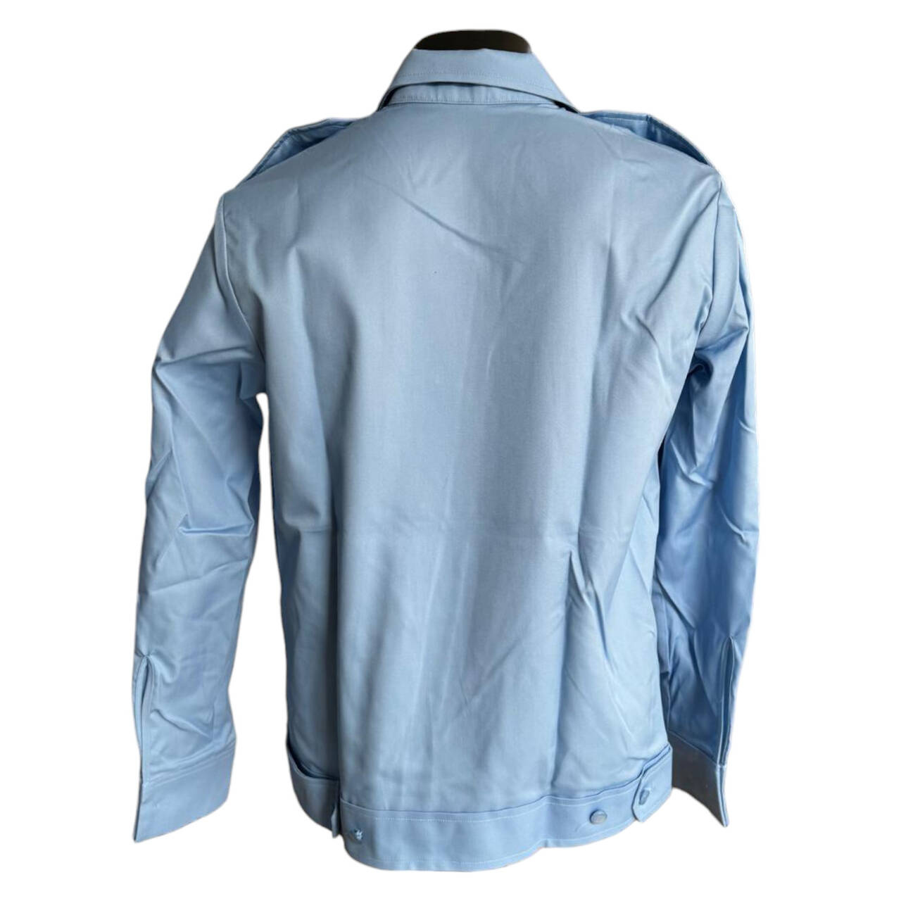 Men's long-sleeved blouse shirt with long sleeves and band at the termination is made of blue poplin fabric. Two pockets with flap and flap flap are applied on the upper chest. The upper back has a double placket and epaulettes on the shoulders. The shirt has a drawstring at the hem which is adjusted with buttons and button fastenings. The left sleeve is fastened with the specific badge.