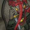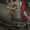On the front is the image of a Motanka doll in a traditional Ukrainian outfit. Holding a sword, which is a symbol of the Cossack spirit and fighting exploits, she courageously stands in defense of Ukraine, sending her accursed enemies to hell. The skull of one, she holds in her hand. The Motanka doll is dressed in an embroidered jacket, in which the code of the nation is "sewn". It symbolizes the connection between generations; the present, the past and the future of the Ukrainian people. The Motanka has no face, instead a cross is wound from ribbons, like the ancient symbol of the sun among the Slavs. According to folk beliefs, it protected the owner of the doll from evil spirits.