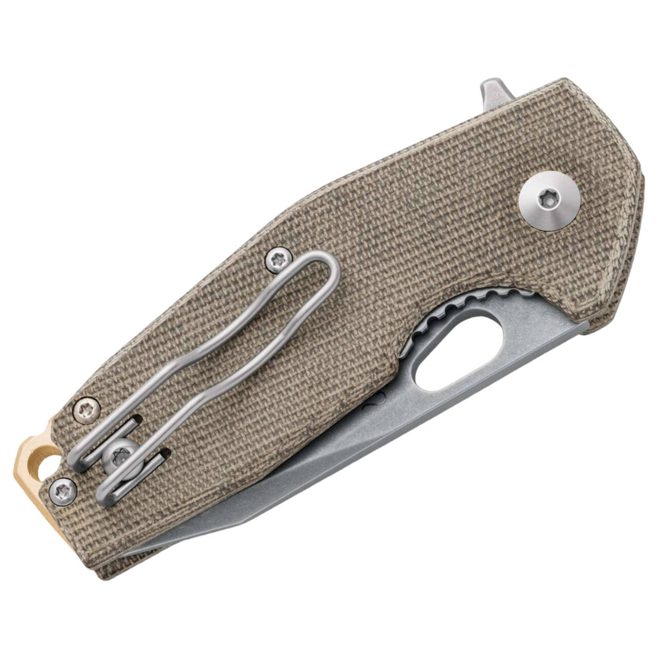 The extravagant Suru by Jesper Voxnaes looks good because it has the liner lock system as its locking mechanism. The pocket knife has a bulbous M398 blade, which can be opened with a flap or thumb hole. The green Micarta handle is harmoniously accented by a gold anodized backspacer, with a reversible tip-up clip and lanyard hole.