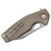 The extravagant Yaru by Jesper Voxnaes also looks good with a liner lock as a locking mechanism. The pocket knife has a bulbous M398 blade that can be opened with a flap or thumb hole. The green Micarta handle is harmoniously accented by a gold anodized backspacer, with a reversible tip-up clip and lanyard hole.