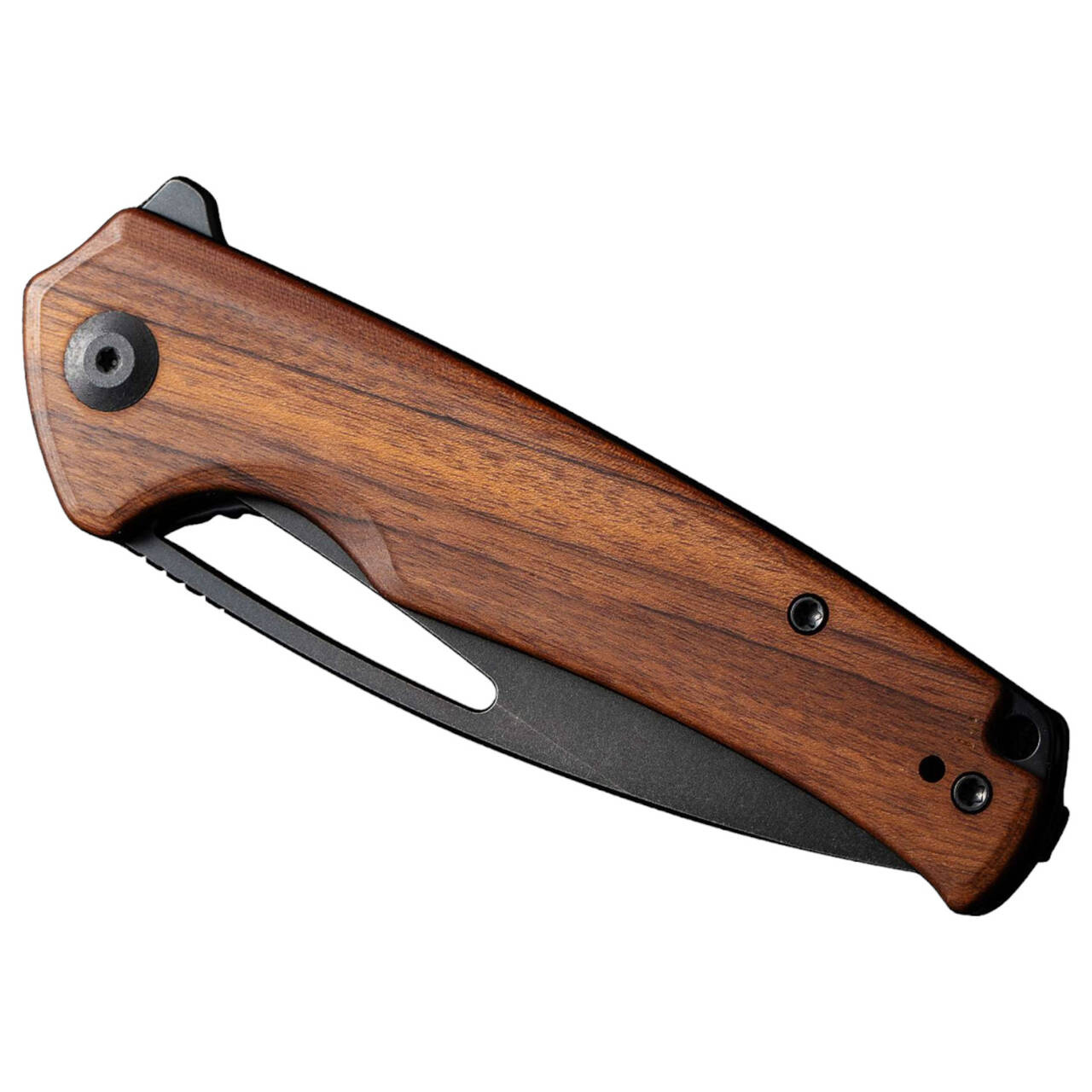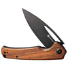 With a progressive and confident design, Mims does the job every day. The pocket knife tackles tough cutting tasks such as slicing through cardboard boxes with deft nonchalance, and the drop-point ball-bearing blade, made from 9Cr18MoV with a stonewash black finish, opens with a flipper or thumb button and locks with a liner lock. The fine guibourtia wood handle provides an excellent grip. Reversible tip-up clip and lanyard hole guarantee a wide range of wearing options.