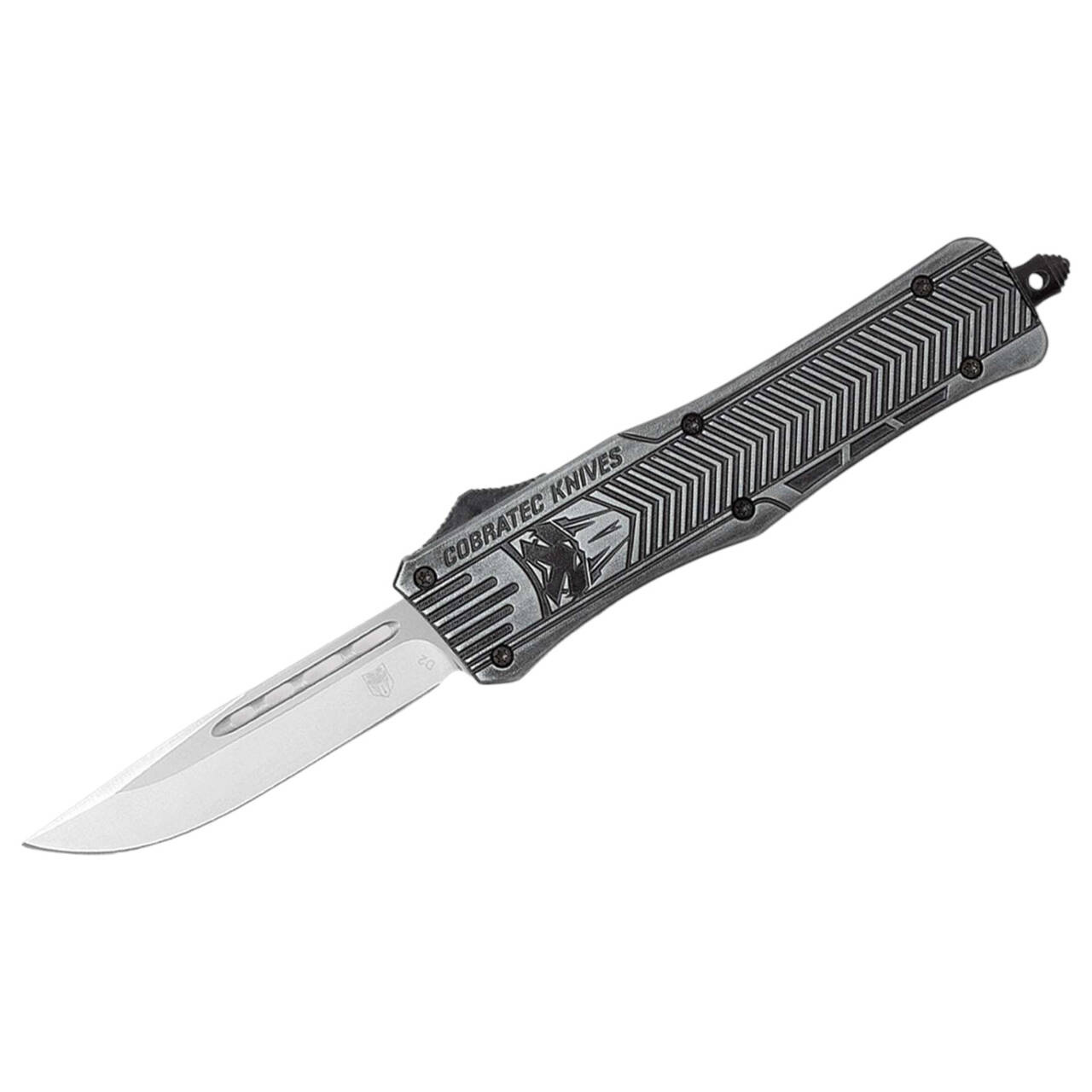 The medium-sized version of the popular CTK-1 convinces with a solid D2 drop point blade, which comes out of the front handle with the push of a button and disappears again when pressed again. The OTF (Out The Front) knife features a textured handle made of high-strength aluminum with a rustic stonewash finish.. The deep-carry clip is attached to the glass breaker and allows for tip-up carry on both sides. It is supplied with a high-quality nylon pouch.