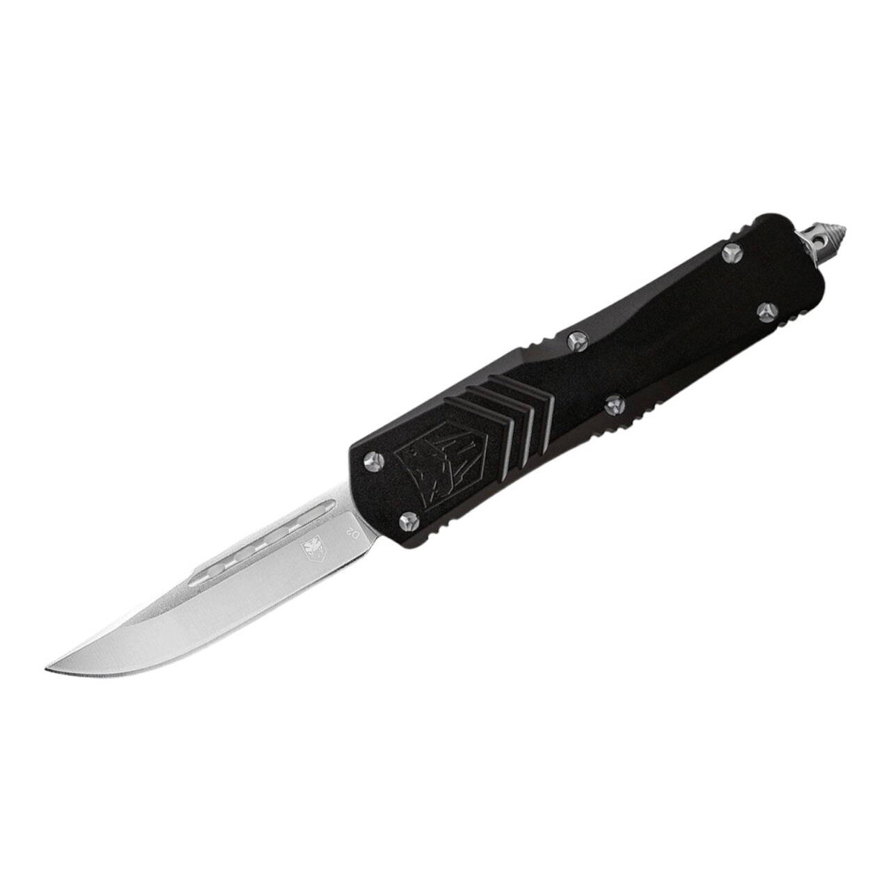 The compact CobraTec Small FS-X OTF Black convinces with its blade made of D2 and the non-slip handle made of aluminium. The blade automatically comes out of the front handle (out the front) at the push of a button. With nylon case, glass breaker and clip (tip-down/r).