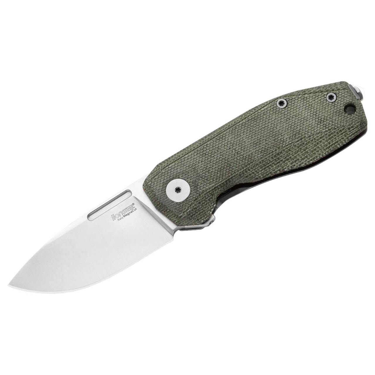 Elegant, neat, and equipped with the power of a lion: The LionSteel Nano is an elegant EDC knife that does not deny its noble origins. The titanium handle with green Micarta front scales draws attention to the textured top and bottom, while the sides of the handle are smooth, creating an interesting contrast. A flipper or nail cut can open the MagnaCut blade; the frame lock promises regular safe handling with a deep-carry clip (tip-up/r).