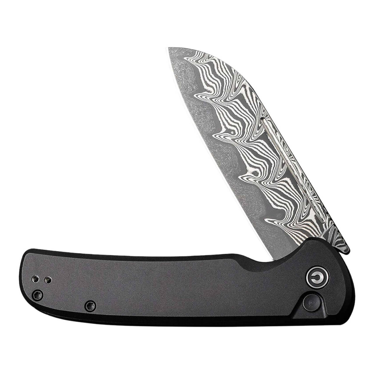 The CIVIVI Chevalier II presents itself without fear or reproach as a practical EDC folder with classic and modern elements. Thanks to its merits in the cutting arts and the black, ball-bearing sheepfoot blade made from fine Damascus, the knife has rightly been elevated to the rank of nobility. The chivalrous attitude also includes generosity, which the pocket knife impressively underlines thanks to the flipper and nail nick. The button lock fits humbly into the black aluminum handle and always secures the blade with bravery. The curved clip is reversible (tip-up) and can be seen as a metallurgical homage to the minnesong.