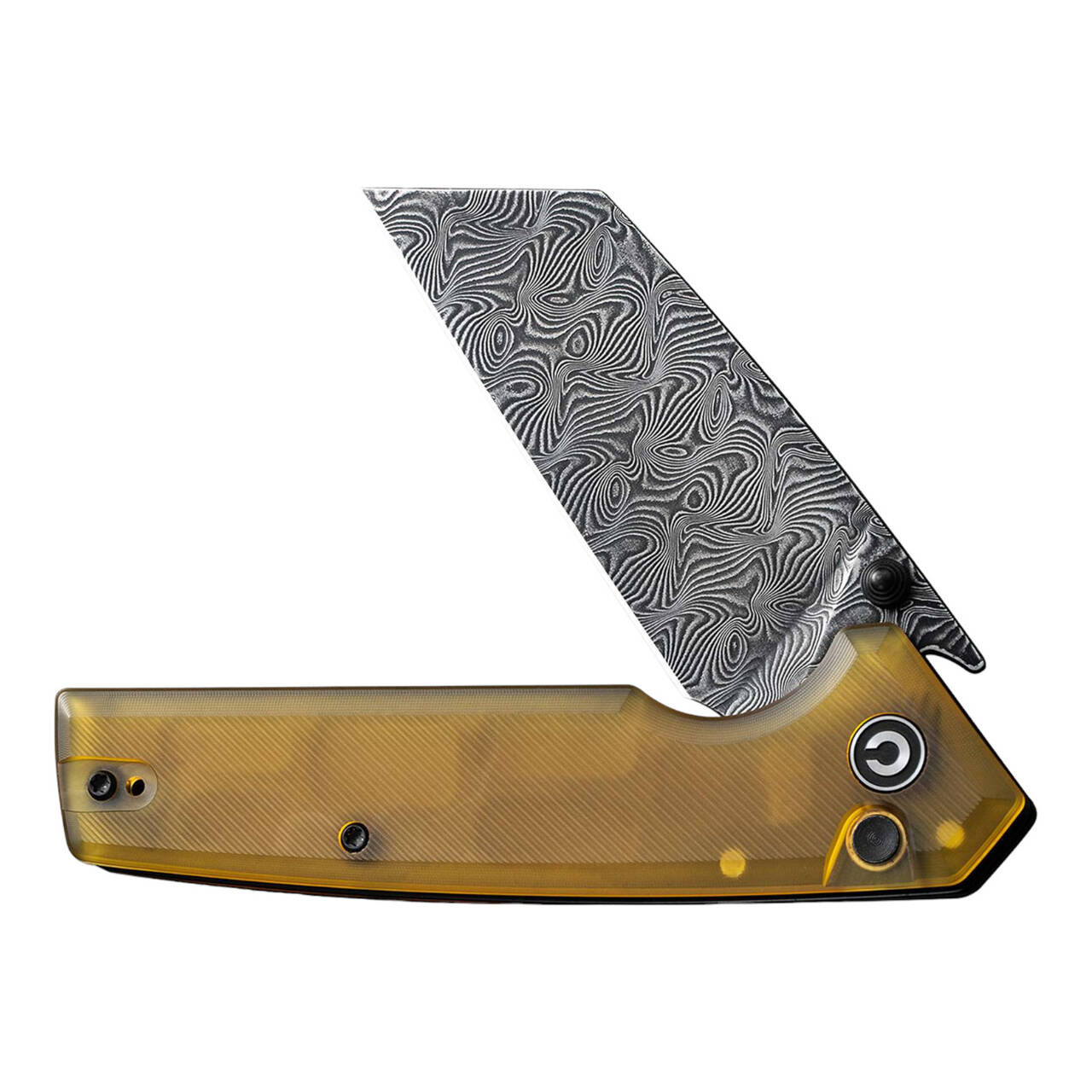 Amirite, or rather: Am I right? With the pocket knife of the same name, CIVIVI says a resounding yes, because suitability for everyday use is a top priority here. The Damascus reverse tanto blade with ball bearings is opened with a thumb stud and locked with the intuitive button lock. The Amirite is therefore perfect for both precise and powerful cuts. Textured handle scales made of amber-colored Ultem and a reversible deep-carry clip (tip-up) emphasize the light-footed appearance of the folding knife.