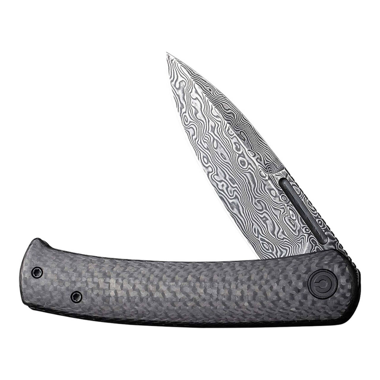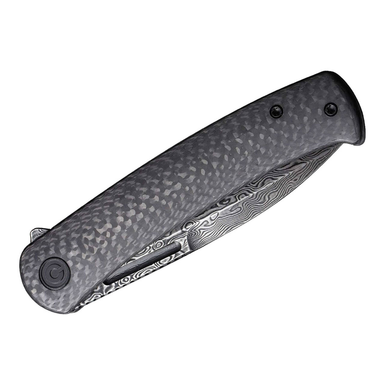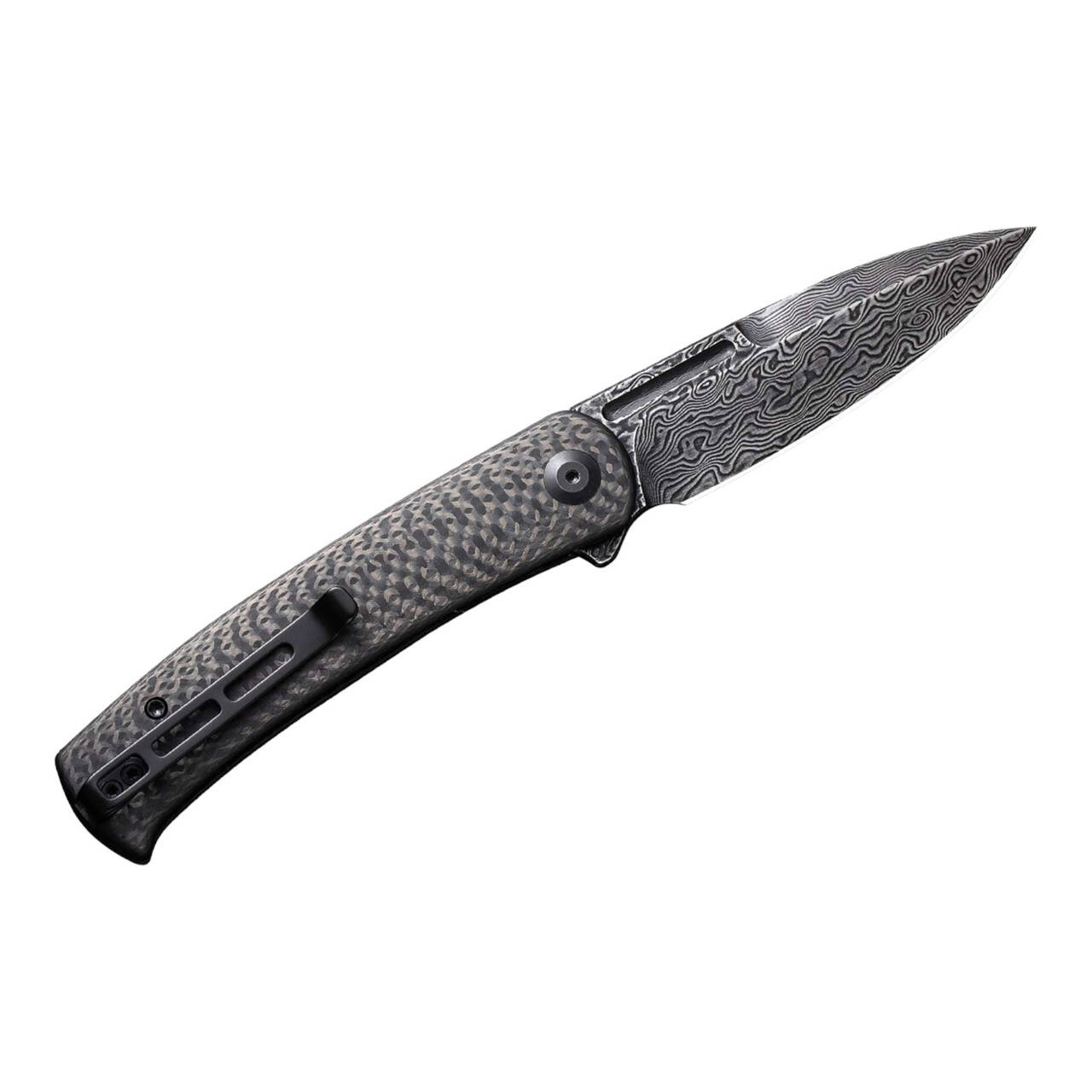 The CIVIVI Caetus combines in this noble version everyday performance with simple elegance. The pocket knife with ball-bearing Spearpoint blade made of damascus opens either by flipper or nail cut and locks by the stable liner lock.The carbon fiber handle scales lie comfortably in the hand, while the tip-up clip (r) allows deep carry.
