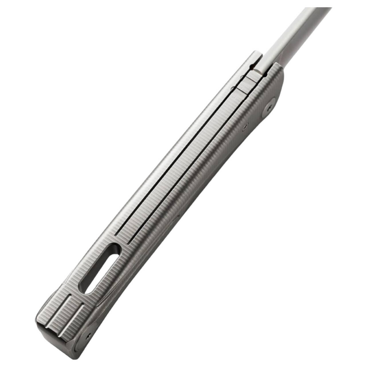 The LionSteel Thrill Titanium is an ultra-modern slip-joint pocket knife with an ergonomically shaped handle milled from a single, solid piece of grey titanium. The resulting extremely stable construction also features a retractable clip, the patented HWAIL system. The satin-finish drop point blade is crafted from powder-metallurgical Böhler M390 steel, which exhibits impressive wear and corrosion resistance. The spring tip of the handle is reinforced with a treated stainless steel insert. The reliable IKBS ball bearing system allows ultra-smooth blade deployment that opens with a nail nick. With a detachable, retractable clip (tip-up).