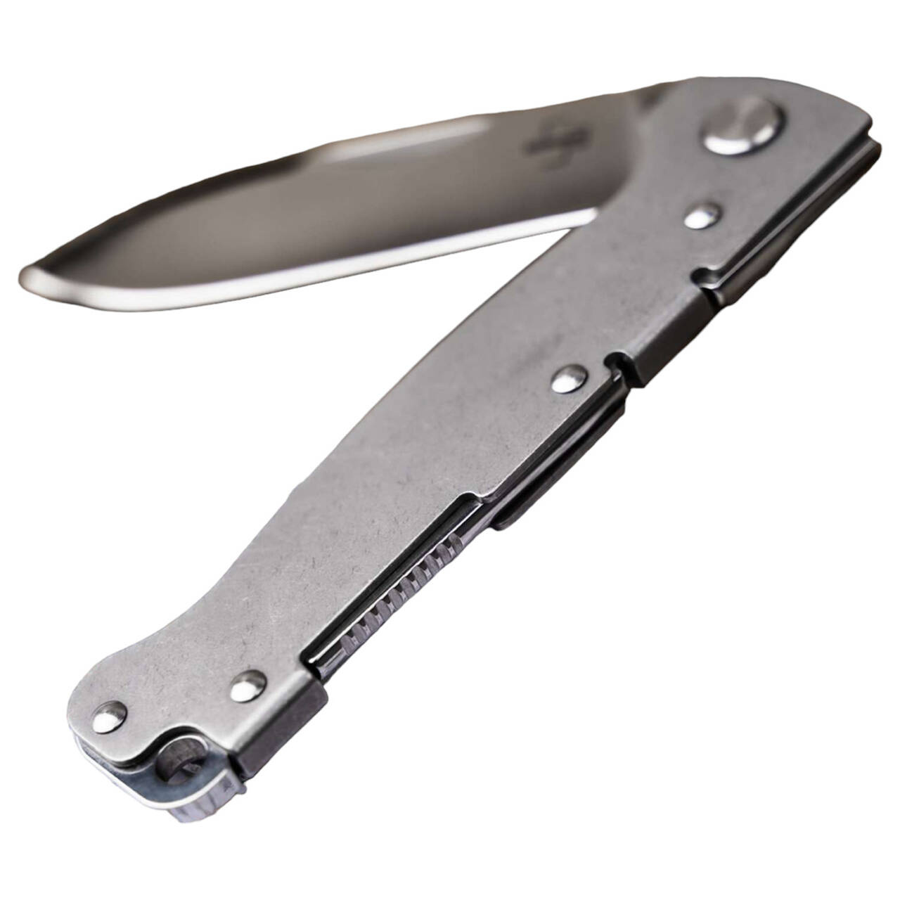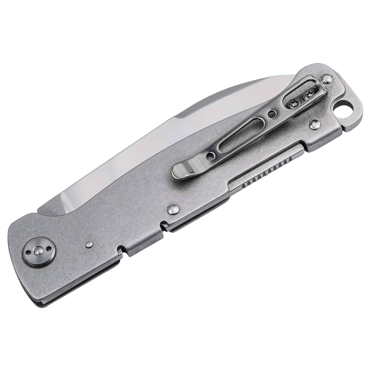 The tidy Boker Plus Atlas is a reliable pocket knife with a stainless-steel handle in a gritty stonewash finish. The minimalist construction is exceedingly robust and makes the handy knife the perfect companion in all situations. The satin-finished D2 drop-point blade is opened by nail nick, while the locking is taken over by the sturdy backlock. Supplied with a tip-up clip (r).