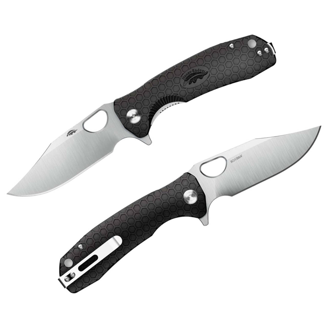 The Honey Badger Clippoint Medium impresses in particular with its robust construction. The 8Cr13MoV clippoint blade is extremely robust and easy to sharpen. The thick shaft and wide profile ensure stability and easy cutting. The high-quality ball bearing enables smooth opening and closing of the satinised blade, which can be opened with a flipper or thumb opening and locked with a liner lock. The characteristic honeycomb pattern of the textured, black FRN handle scales ensures a secure grip with a lanyard hole and reversible deep-carry clip (tip-up).