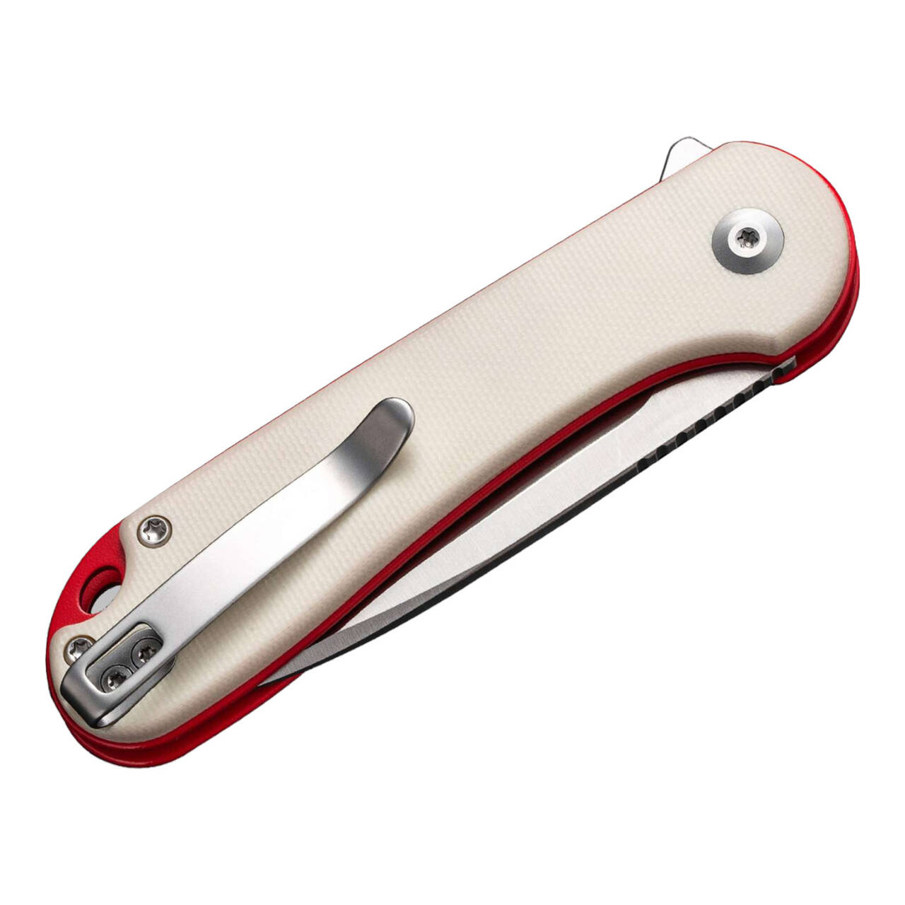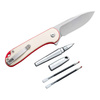 Festive set consisting of the Button Lock Elementum II and the StellarQuill Pen by CIVIVI. The Button Lock version of the popular Elementum by CIVIVI features creamy white G10 handle scales on red liners and a Nitro-V blade for a Christmas feel. The rugged appearance, reliability, and last but not least, excellent value make the Elementum an excellent choice for everyday carry. The ball-bearing blade can be opened manually and smoothly thanks to the flipper. It is unlocked again with the button lock. With catch strap eyelet and deep carry clip (tip-up/r). The CIVIVI StellarQuill Pen is an elegant ballpoint pen with a screw cap made of high-strength aluminum, equipped with a lanyard loop for attachment to a keychain. The ribbed grip body provides good control and clean writing. Supplied with two refills.