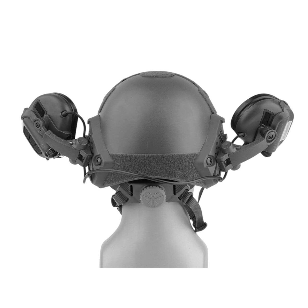Active hearing protectors with earphone holders. Suppress intense noises without stopping conversations. 3.5mm AUX audio input. NRR of 22 dB. Meets MIL-STD-416 and MIL-STD-810G standards and IP67 protection rating. Color: black.