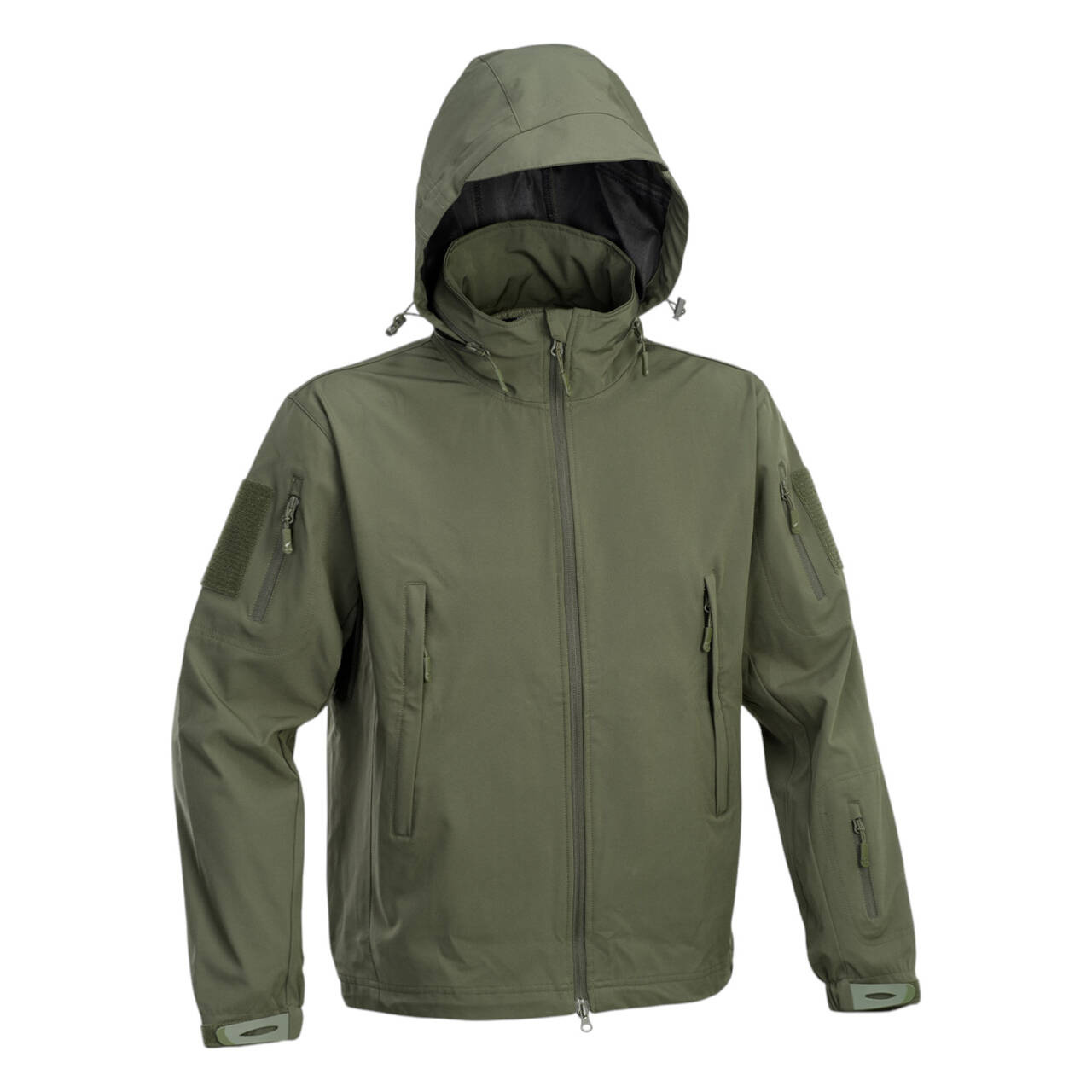 Lightweight softshell tactical jacket with detachable hood with 2 inside zippered pockets and water-repellent, windproof, breathable outer shell composed of 92% polyester and 8% spandex.