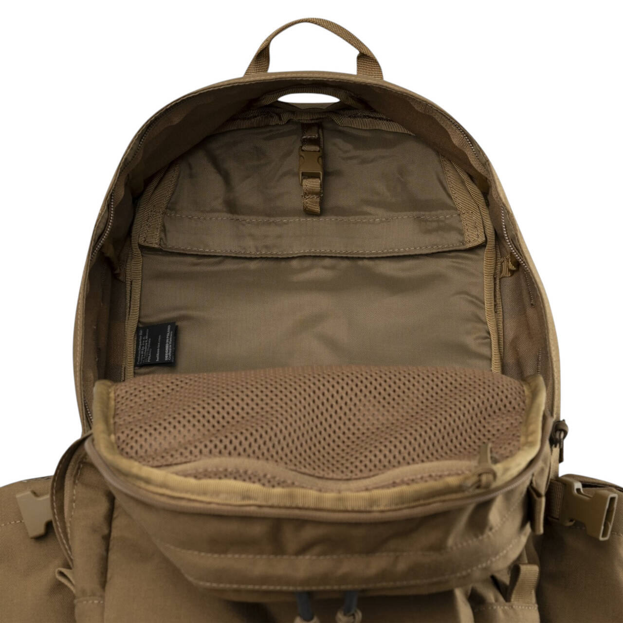 The front pocket, located at the top of the backpack, has a Velcro panel for customization, and its interior is lined with soft velour to safely carry optics or night vision devices. The lower pocket can accommodate smaller gear items. The backpack also has a pocket with an extra section for a combat helmet, camouflage netting or a Ghillie Leaf set. The extra extension (beavertail) can be rolled up and stored in a flat compartment at the bottom of the backpack if needed. Two side pockets can hold a supply of water or ammunition. Above the side pockets are MOLLE/PALS-compatible straps, which allow the addition of grenade pockets or magazine pockets. Inside the backpack is a compartment with space for a hydration bladder.