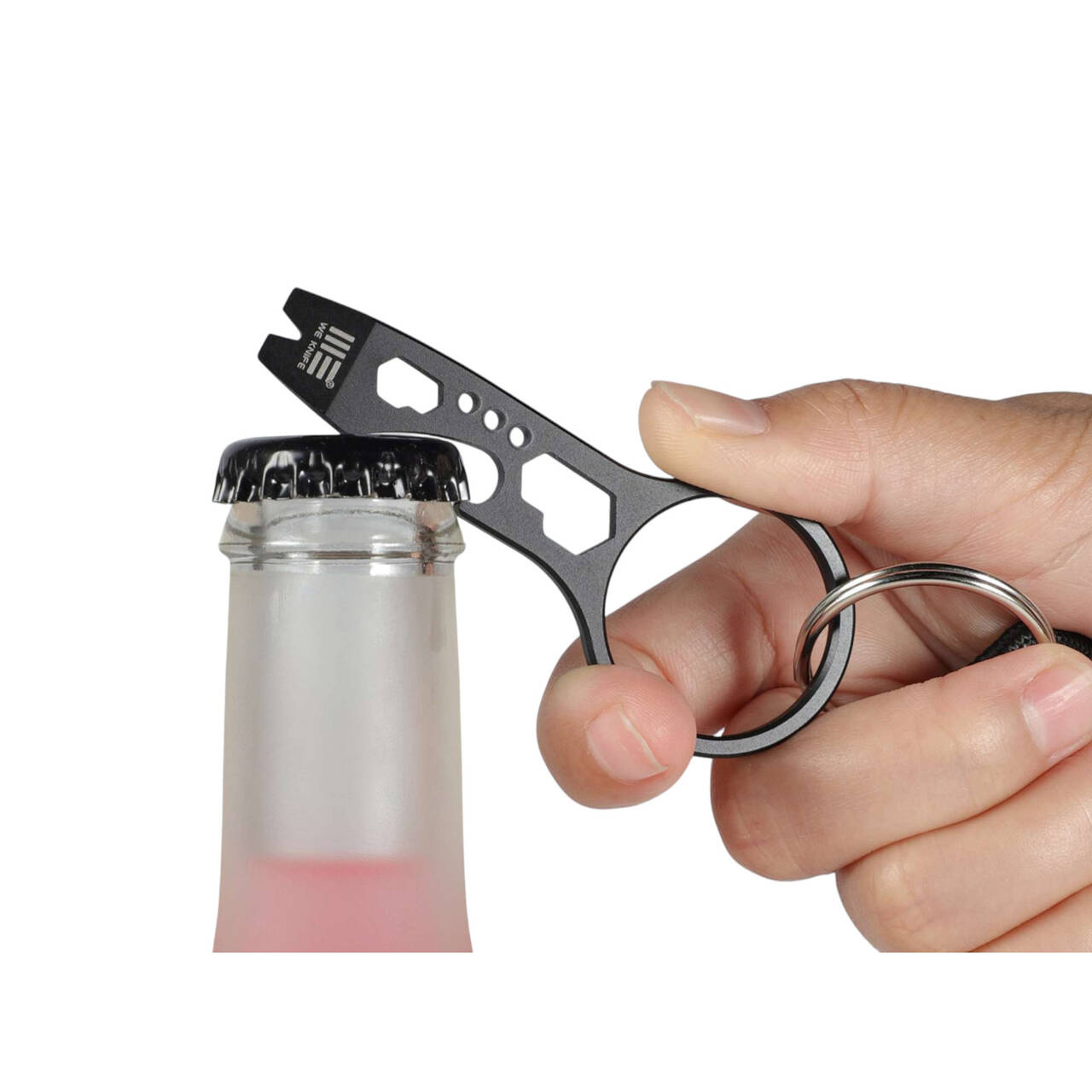 Practical black coated stainless steel practical mutlitool with mini chisel, bottle opener and hex key in sizes 4mm, 5mm, 6mm and 8mm. Complete with a tactical-look key fob with the inscriptions WE Knife and CIVIVI.