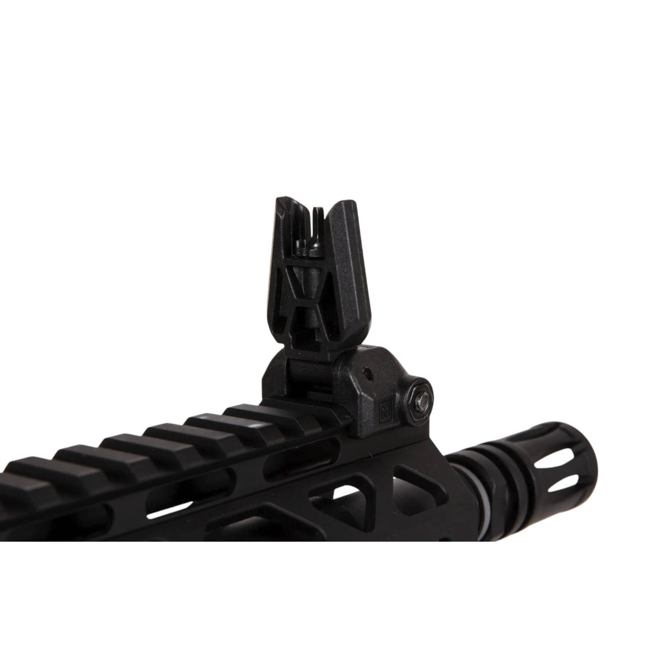 The replica is equipped with an RRA Lightweight Free Float Rail front rail in M-LOK licensed from Rock River Arms®. The barrel is finished with a standard exhaust mounted on a 14mm CCW thread. On the rear of the replica are folding sighting tools.