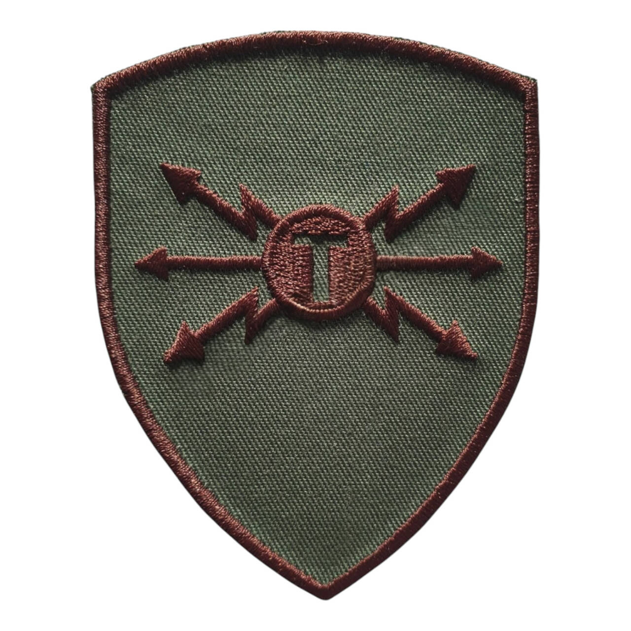 • EMBLEMA SEMN DE ARMA MANECA SCUT - COMUNICATII SI INFORMATICA - BRODATA PE SUPORT KAKI CU FIR MARO
