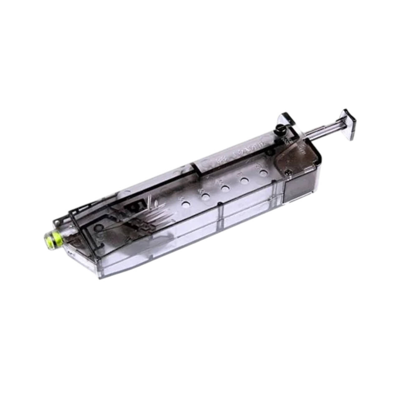 Transparent ACM ball feeder. Facilitates ball feeding of airsoft replica magazines.