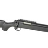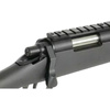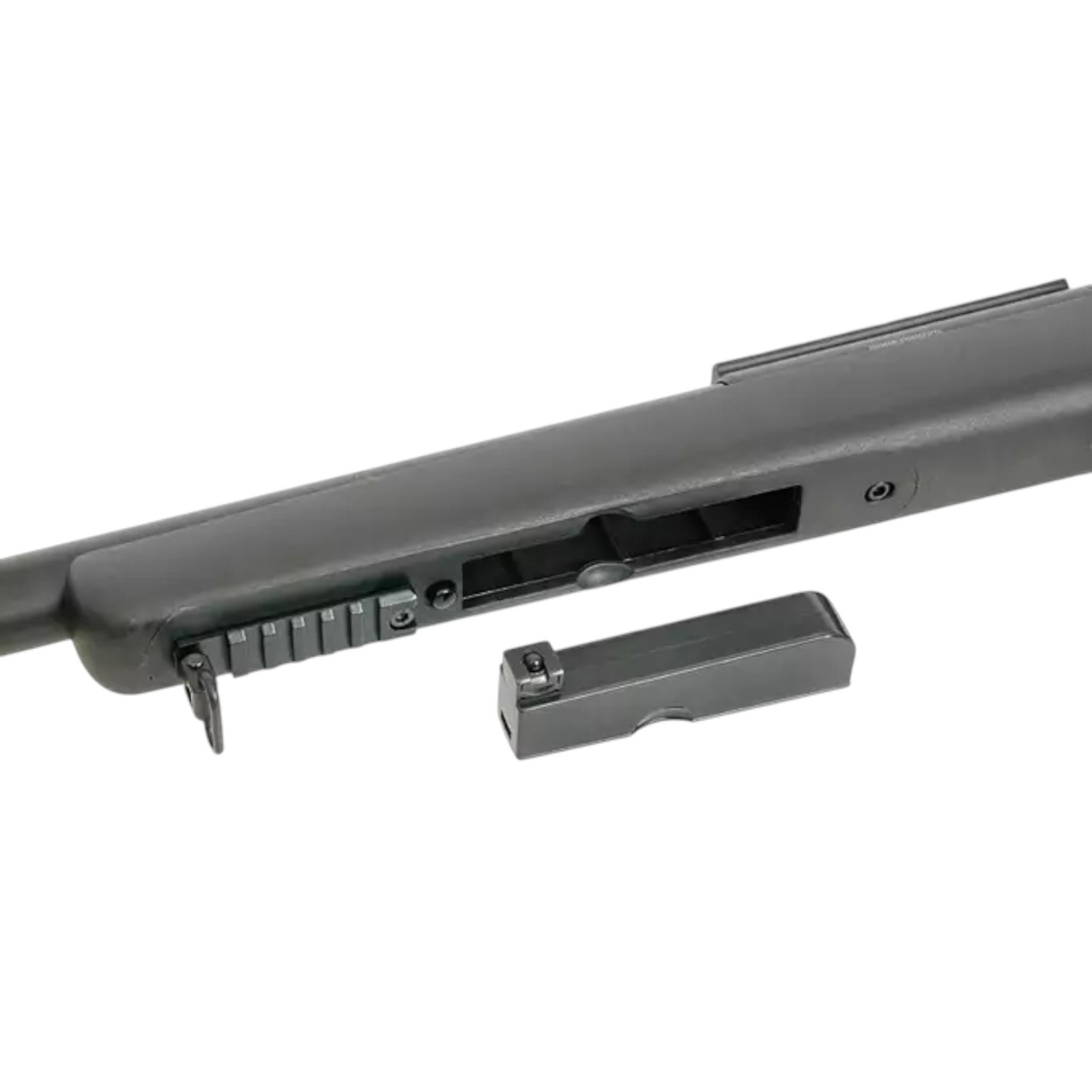This bolt-action airsoft sniper rifle requires manual reloading (spring tension) before each shot, which is typical for spring-powered replicas.The rifle is equipped with an aluminum barrel, and the chamber features a 22 mm Weaver rail for mounting optics. The stock is made of durable polymer and features a textured finish, ensuring a secure grip even in challenging conditions. Additionally, the stock is equipped with a Picatinny rail for mounting a bipod and sling attachments.