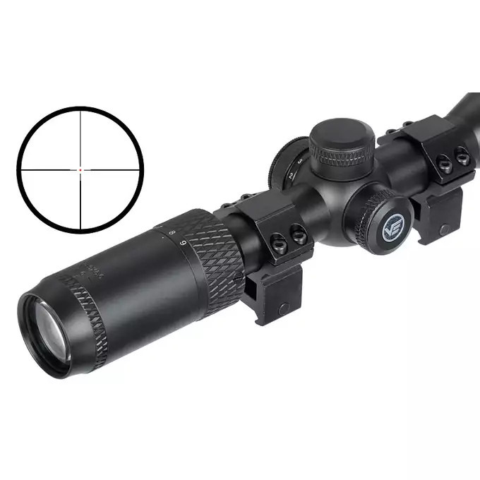 Matiz scope with 3-9x magnification, 50mm objective and 25.4mm tube diameter from Vector Optics, which has been producing high quality scopes and red dots for firearms for over 10 years. Body providing waterproof and shock resistant up to 600g made from high quality 6061-T6 aluminum with a durable matte black finish. Sight tested on .223REM, .308WIN ammunition. The interior has been nitrogen purged to prevent lens fogging. The optical glass is coated with an anti-reflective multi-coating. Diopter compensation in the range of -2 to +2 and elevation and windage adjustment range 60MOA (1/4 MOA click value).GERMAN RETICAL NO. 4 reticle. 11-level reticle illumination brightness adjustment. Powered by one CR2032 battery (not included). Mounting rings included for Picatinny rail and a rubber lens cap.