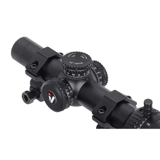 The telescope offers a wide range of adjustments. Diopters can be adjusted from -2 to +1.5, and vertical and horizontal reticle adjustment is up to 200 MOA (1 click - 1/2 MOA). The VMD-2 reticle allows precise aiming at different distances. In addition, the scope has a 5-step reticle illumination intensity adjustment, which allows you to adjust the brightness to the prevailing conditions.