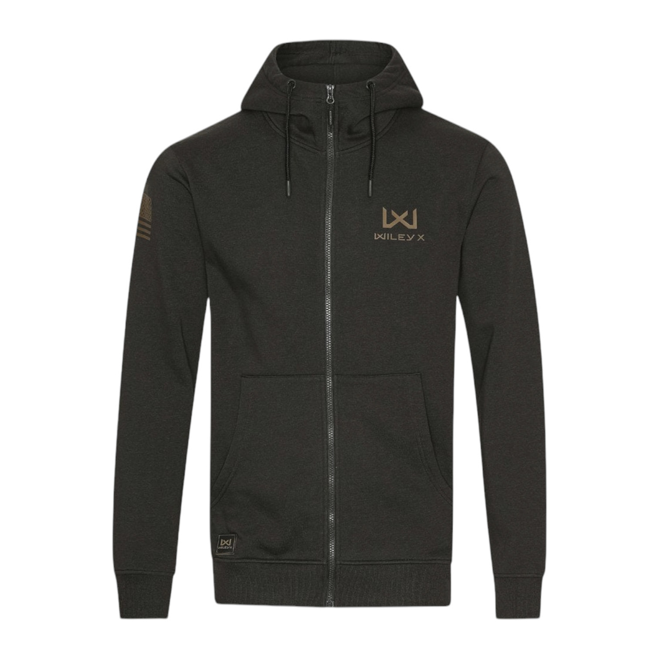 The hoodie is made from 70% cotton and 30% polyester, giving the wearer a nice, soft quality that will keep them comfortable all day long. It has a zipper so you can wear it open or closed, depending on your preference. It's designed with a small contrast WX/Wiley X logo on the left chest and a WX rubber patch at the bottom of the kangaroo pocket. On the right sleeve, the sweatshirt features a print of an American Assault Flag, which means the stars of the flag are facing forward, depicting the movement of the flag as seen on American uniforms.