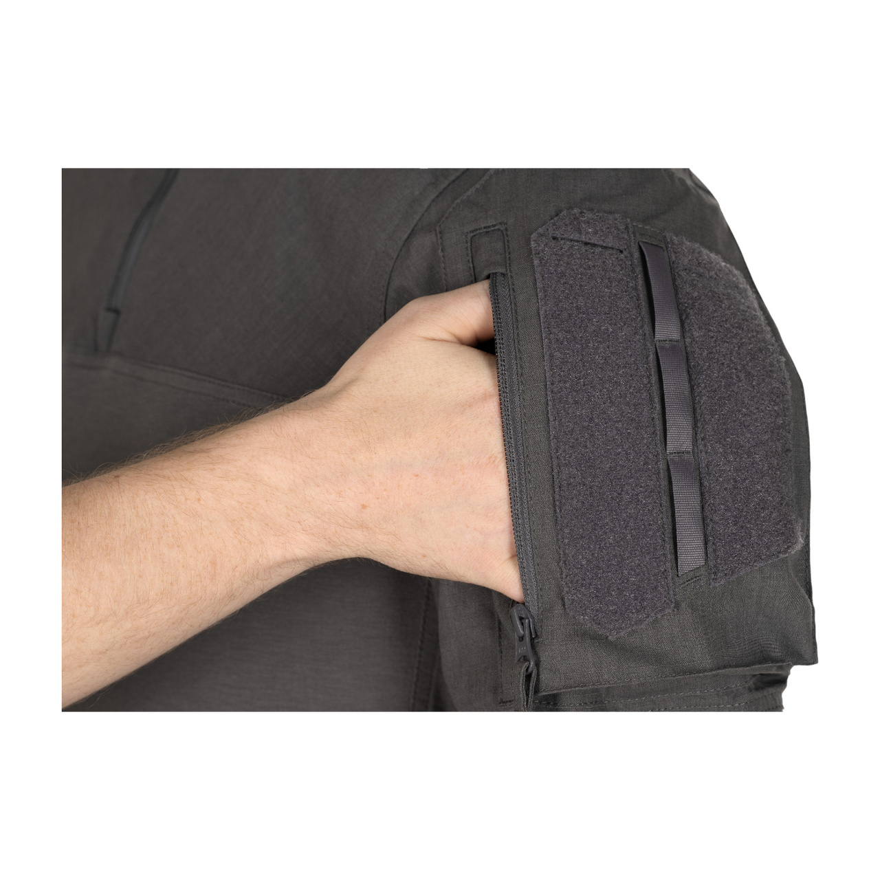 The elbow and outer forearm areas offer additional durability thanks to a ceramic coating applied to the NYCO main fabric. The large upper arm pocket is accessible via a zipper and allows gear to be secured with internal loops. Velcro patches and outer loops provide attachment points for IFF markers, V-LITE®, or even a tourniquet. Another Velcro patch is located at the back of the collar.